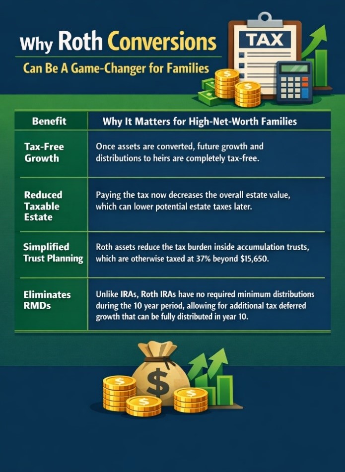 One of the most effective strategies to combat this is a Roth conversion — intentionally paying taxes now to create tax-free growth for future generations.